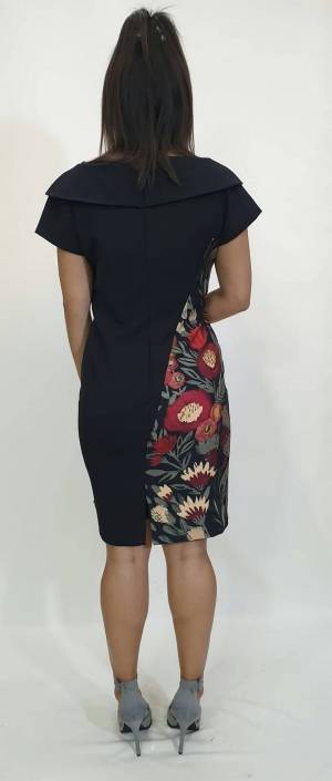 Φόρεμα κοντό σε ίσια γραμμή με σχέδιο floral βολάν στο μανίκι και σκίσιμο μπροστά.