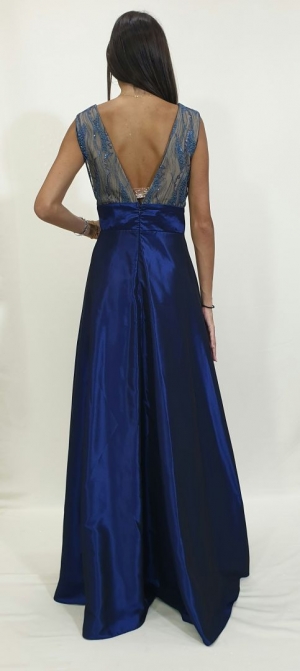 Φόρεμα μακρύ με σατέν φούστα, διαφάνεια στο στήθος και και εντυπωσιακό ‘ν’ στην πλάτη.