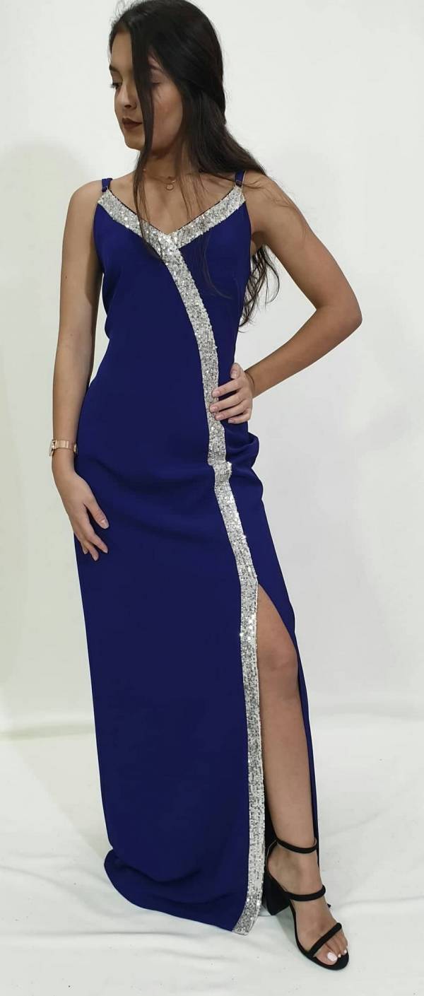Φόρεμα μακρύ σε ίσια γραμμή με λεπτό τιράντακι, με λωρίδα στρας μπροστά και σκίσιμο.