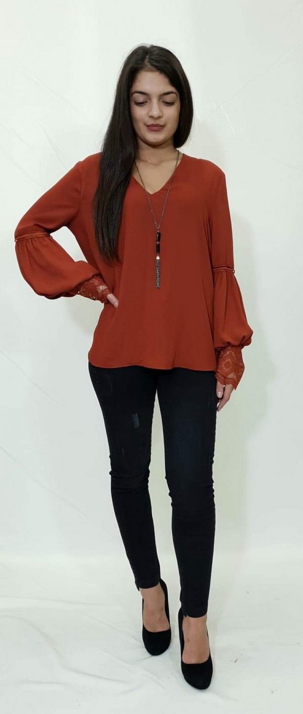 Πουκαμίσα με V μπούστο αέρινο μανίκι καμπάνα που στο τελείωμα έχει δαντέλα